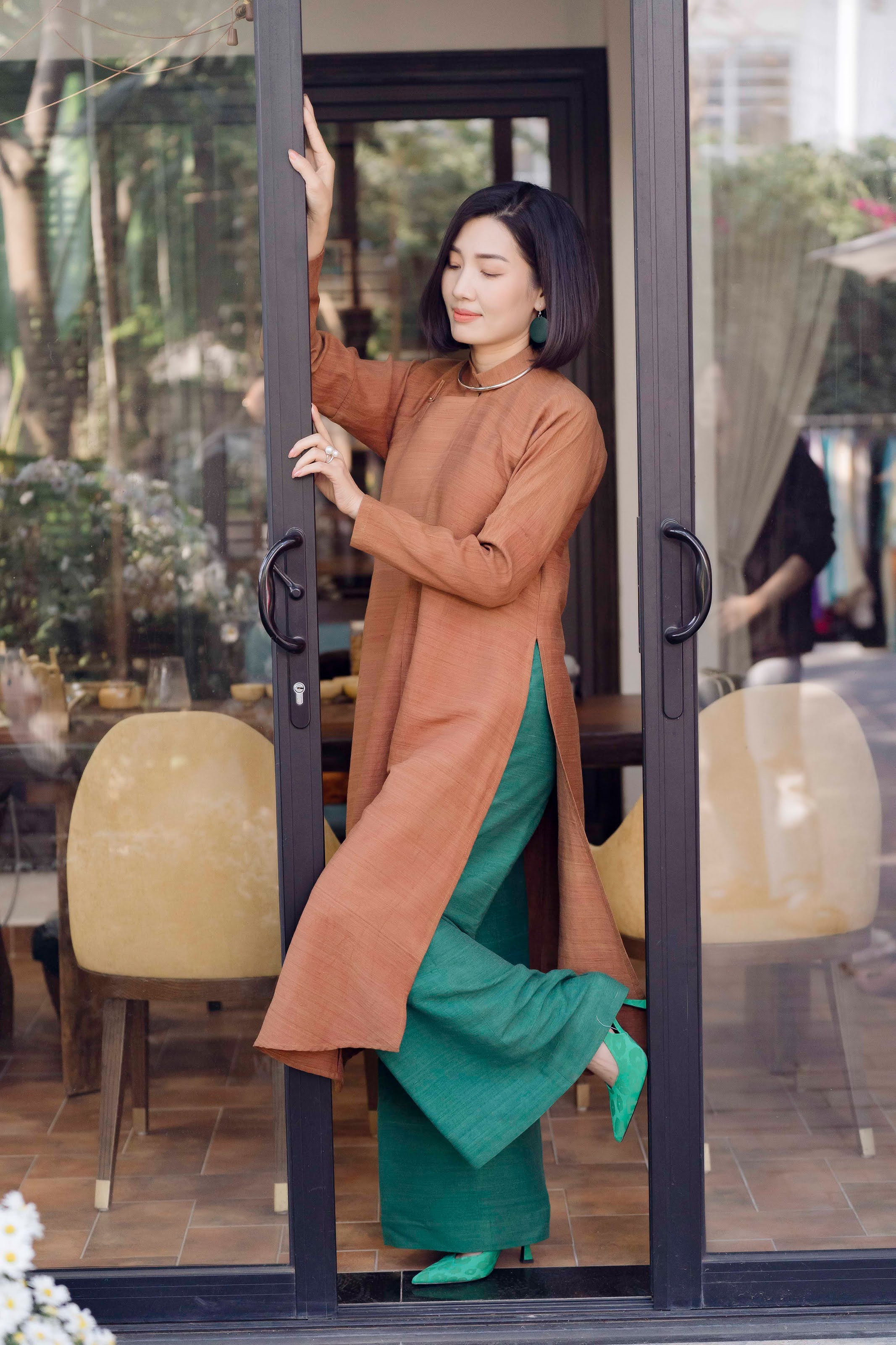 Áo dài ngũ thân “Hoài Niệm Hoàng Gia” được chế tác từ lụa đũi tơ tằm thủ công Nam Cao, nhuộm hoàn toàn bằng củ nâu rừng tự nhiên.